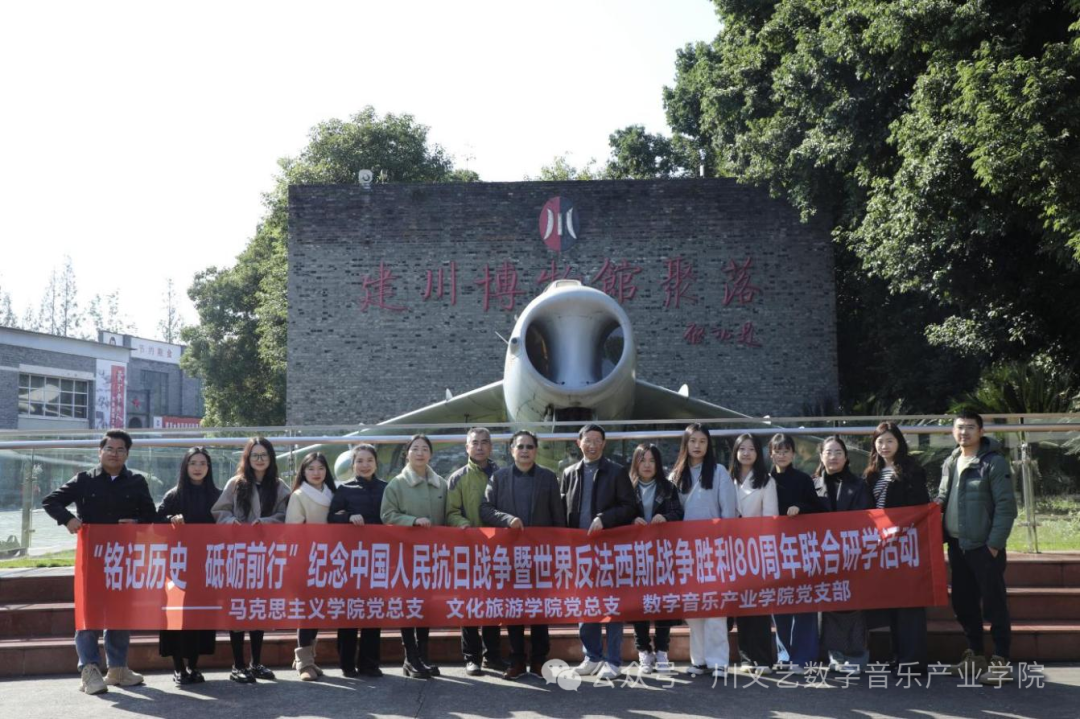 为深入学习贯彻习近平总书记在纪念中国人民抗日战争暨世界反法西斯战争胜利80周年大会上的重要讲话精神,强化党员思想教育,赓续伟大抗战精神,马克思主义学院党总支、文化旅游学院党总支与数字音乐产业学院党支部于2025年11月19日联合发起“铭记历史 砥砺前行”主题党日活动。文化旅游学院院长王建科、党总支书记梁莉、副院长刘昌安,数字音乐产业学院党支部书记黄琬歆,马克思主义学院教师李美霞等十六名党员教师,共同前往建川博物馆开展主题活动。通过实地参观与专题研讨,全体人员重温抗战峥嵘岁月,深切缅怀革命先烈,传承不朽抗战精神,汇聚起奋进新时代的磅礴力量。